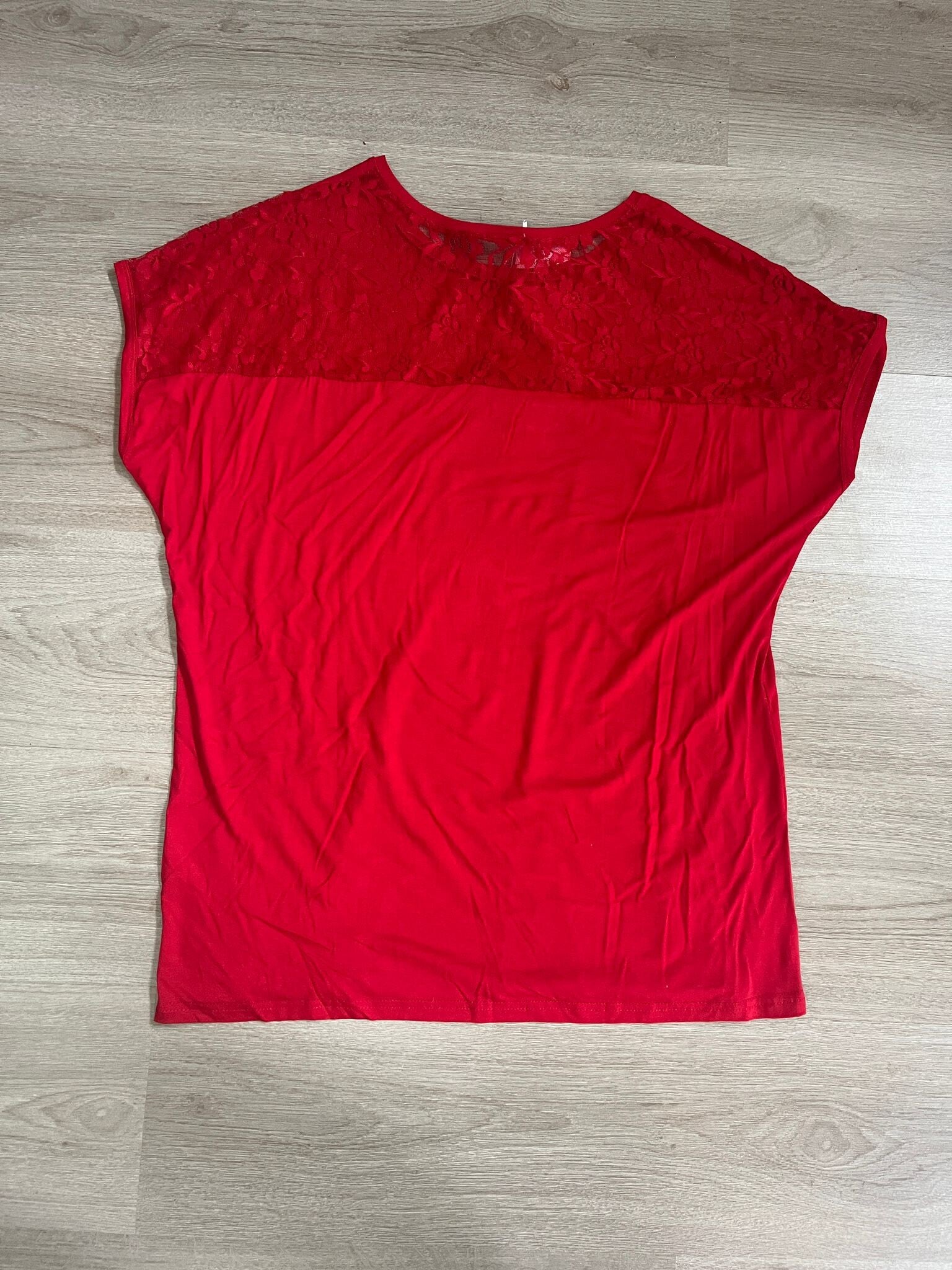 Top met steentjes print en kant op de rug vallen groot.