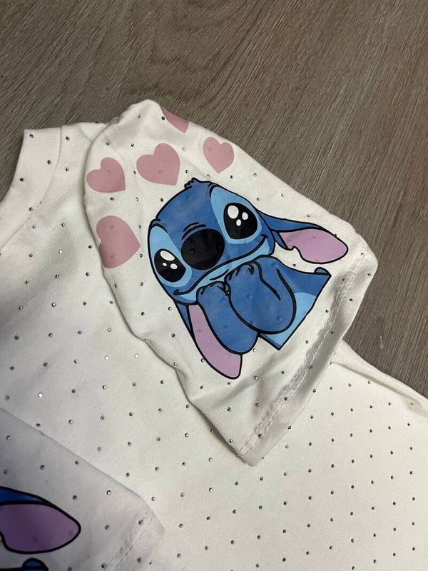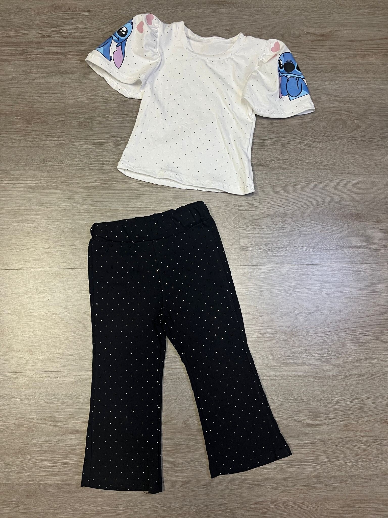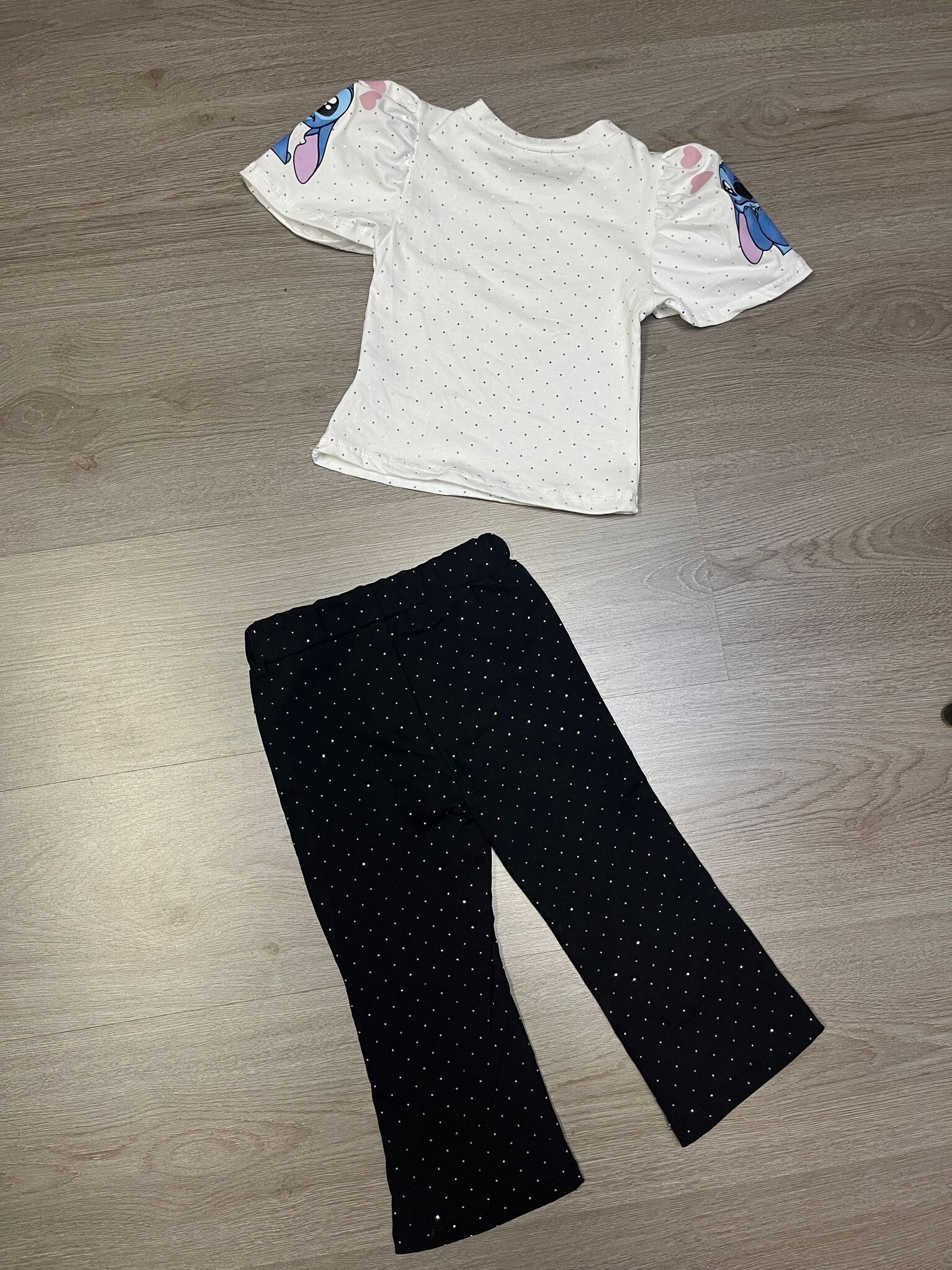Leuke set met steentjes op de broek en het shirt en print op de mouwen.